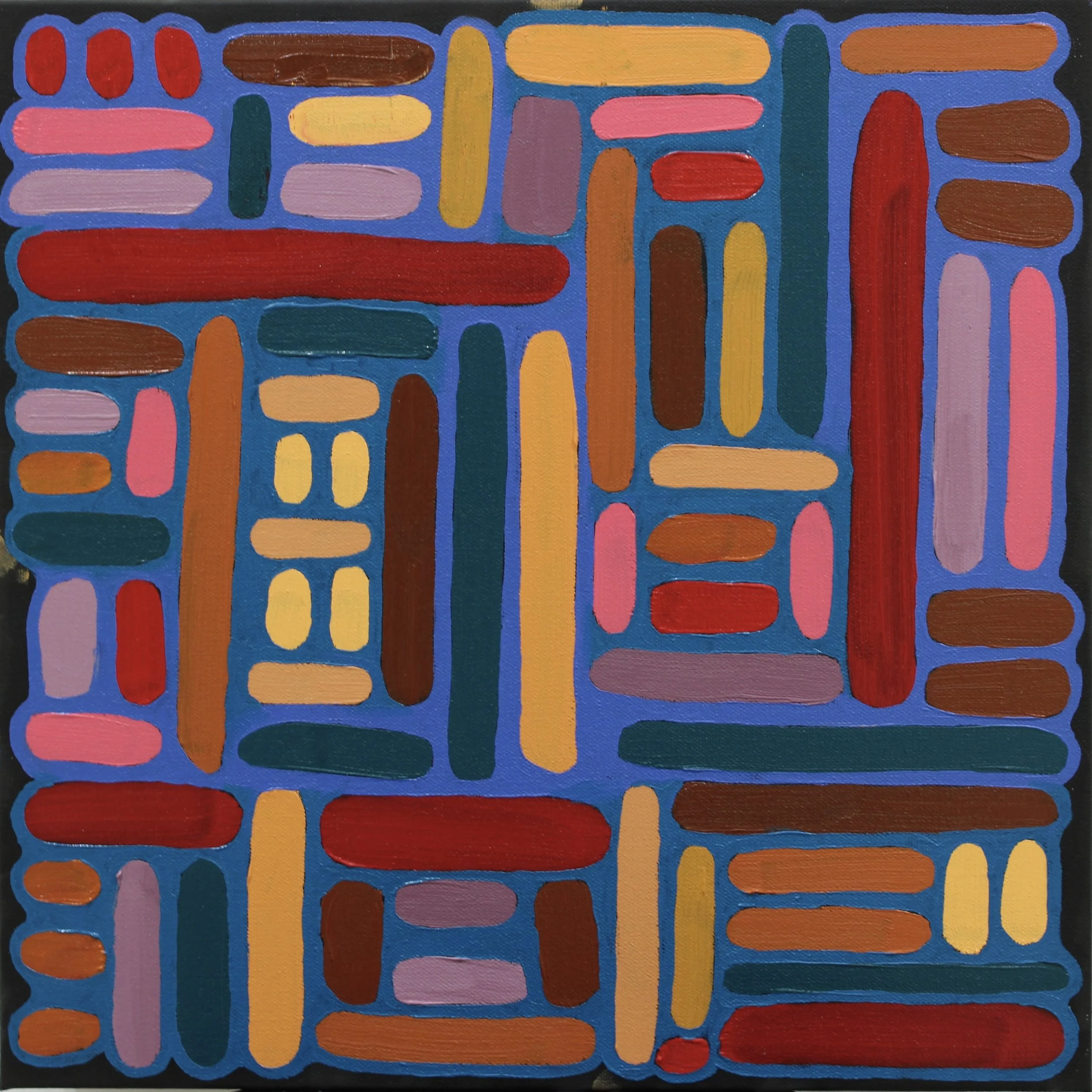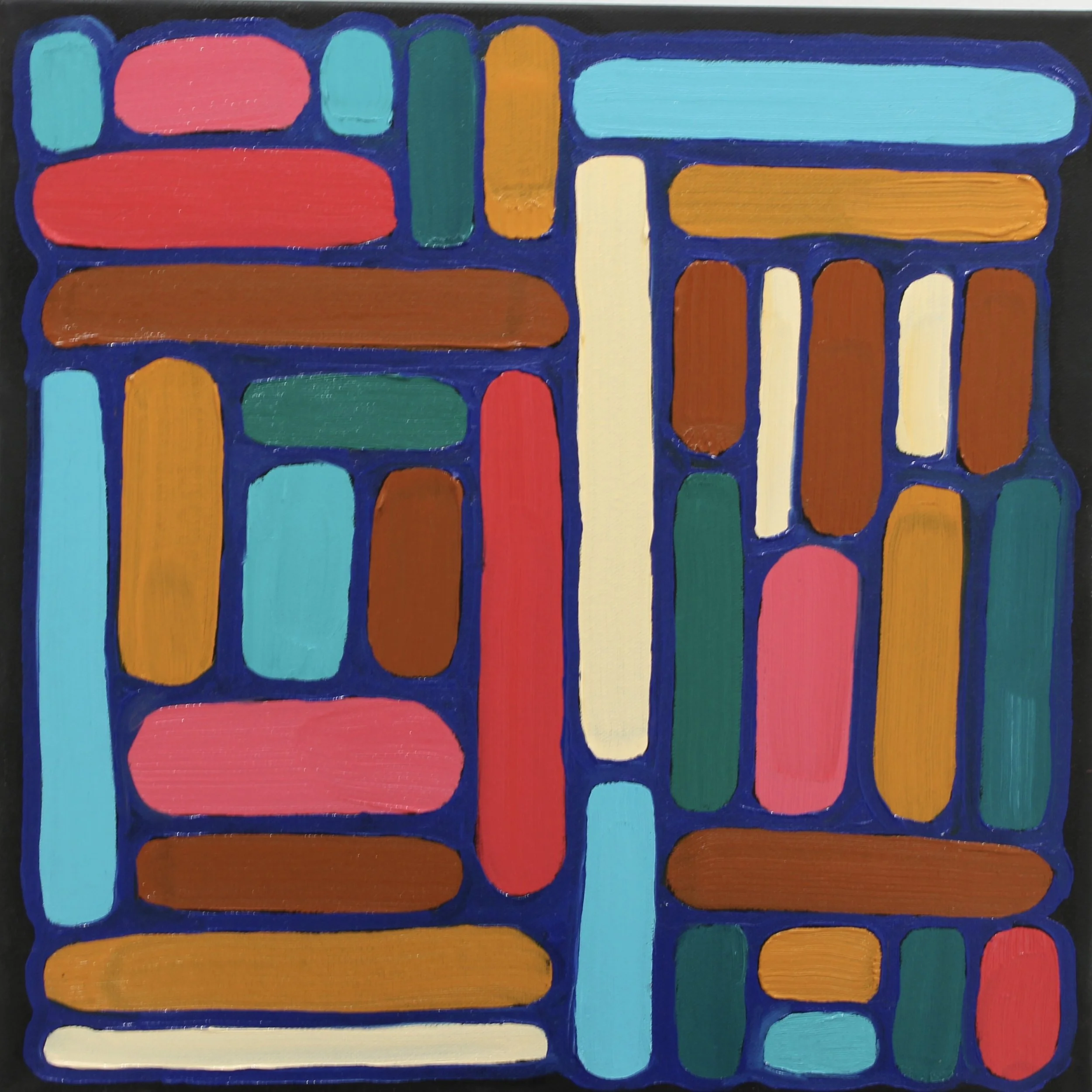 Bradley’s Exclamation presents a geometric composition with bold shapes and saturated colors that collide and intersect. The acrylic work features interlocking forms that spiral inward and outward simultaneously, evoking the clarity of a realized thought or moment of understanding.